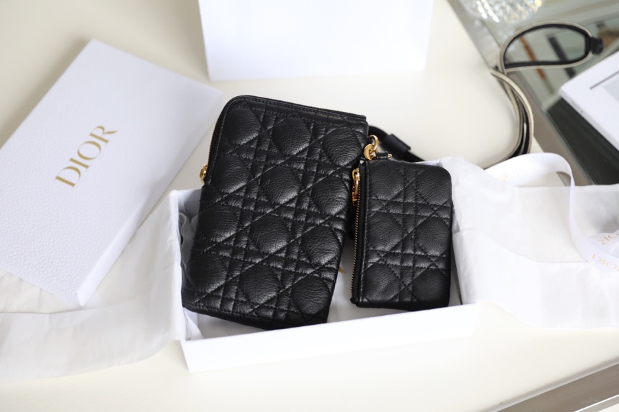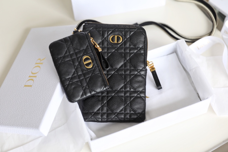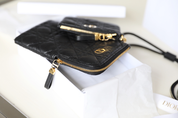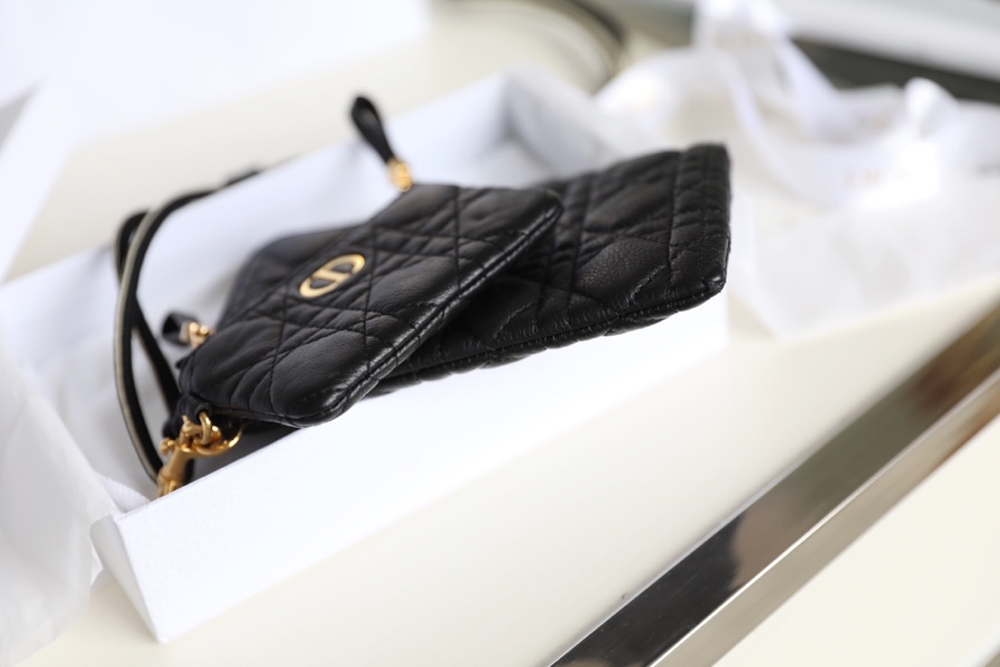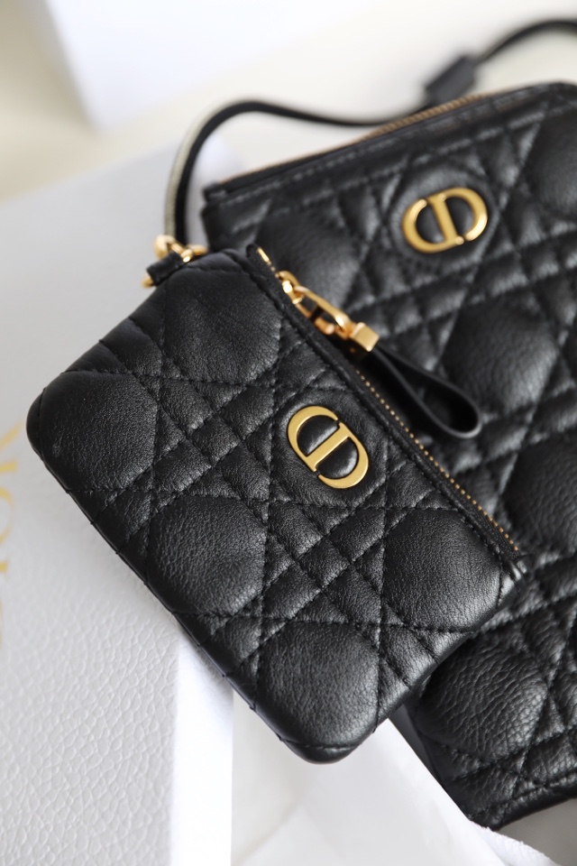 This Dior Caro multifunctional clutch bag is carefully made of black soft cow leather, cleverly blending different elements and decorated with the iconic cannage pattern Ji noodles. Comes with two removable sections and has a zipper. The small pocket holds cards, keys or cash, while the larger, more spacious pocket holds a cell phone. Comes with a detachable chain and lanyard to wear cross-body, around the neck or in a handbag.