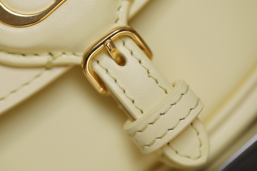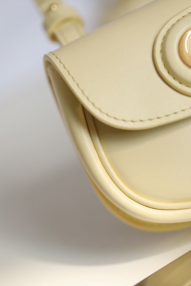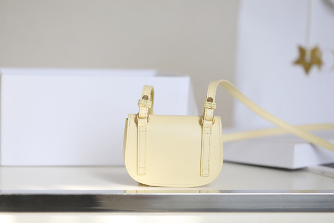 handbag shows elegant silhouette and harmonious proportions. Crafted from light yellow glossy cow leather with a suede lining for a softer feel, it’s finished with antiqued gold-finish hardware. Mini style with detachable and adjustable slide-buckle shoulder strap embellished with military-style buckle, can be carried by hand, shoulder or cross-body