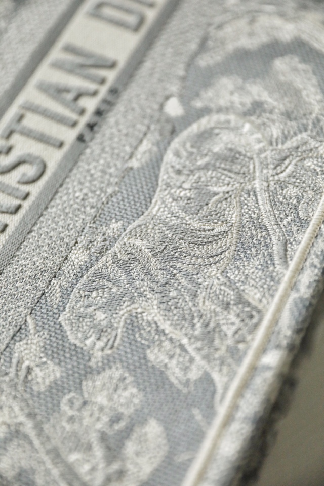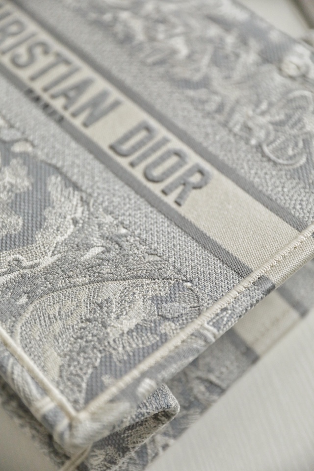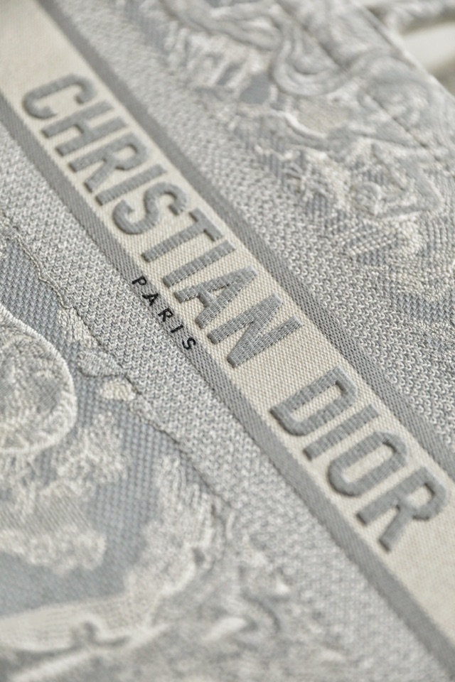 This Book Tote handbag was designed by Dior Women’s Creative Director Maria Grazia Chiuri and is a staple item that embodies the Dior aesthetic. It can store various small daily necessities. It is decorated with gray embroidered Reverse Jouy print throughout, a new interpretation of Dior’s iconic pattern, highlighting the reverse color effect. Small model with “CHRISTIAN DIOR” signature on the front. Reflecting Dior’s signature savoir-faire, this bag can be carried by hand or over the shoulder.