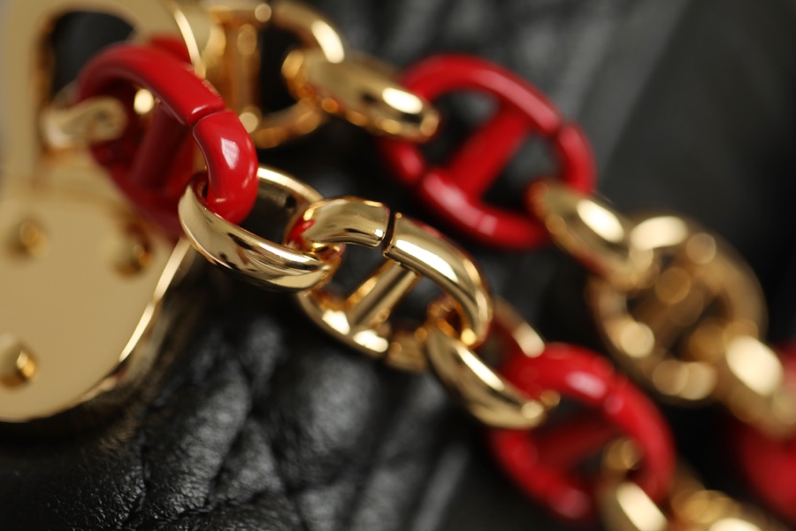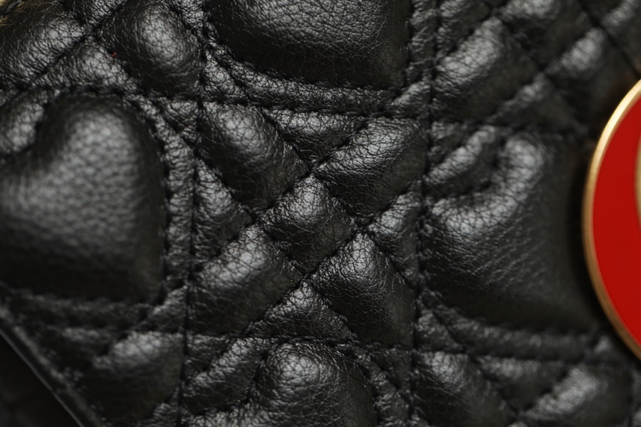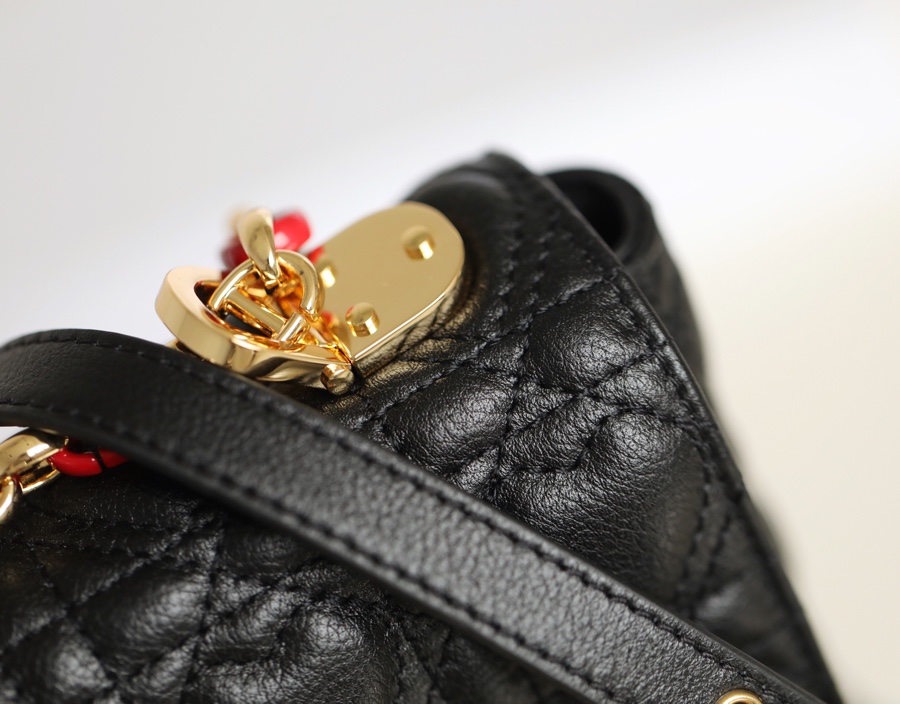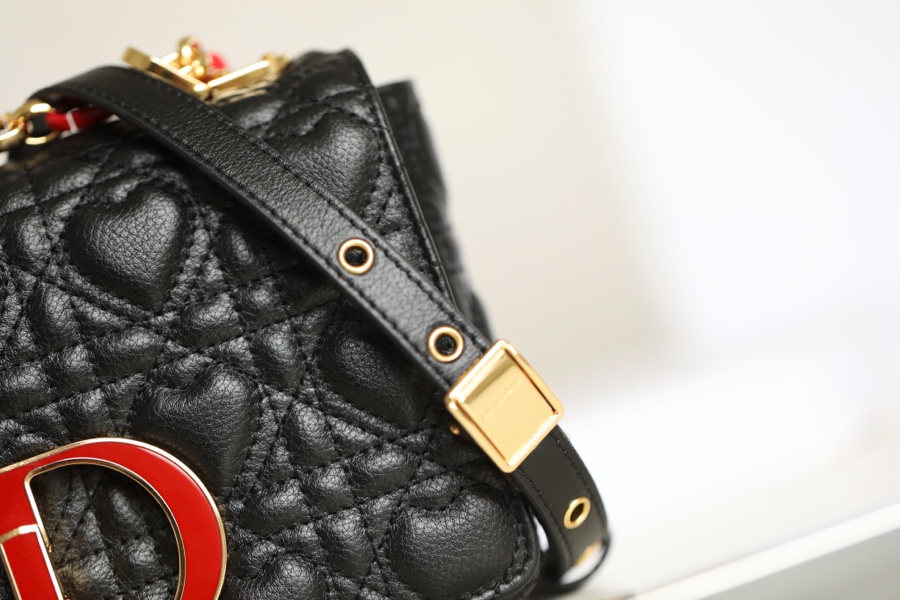 This Dior Caro handbag comes from the Dioramour limited series, combining elegance and modern style. Carefully crafted from black cow leather with heart-shaped cannage pattern topstitching. The flap is decorated with an enameled metal knob-style “CD” clasp, inspired by the closure of Christian Dior perfume bottles. The small style is equipped with a detachable “CD” logo chain shoulder strap as a finishing touch. It can be carried by hand, shoulder or cross-body, or can be replaced with an embroidered wide shoulder strap for a bright finishing touch. Wear it with everyday looks or evening wear.