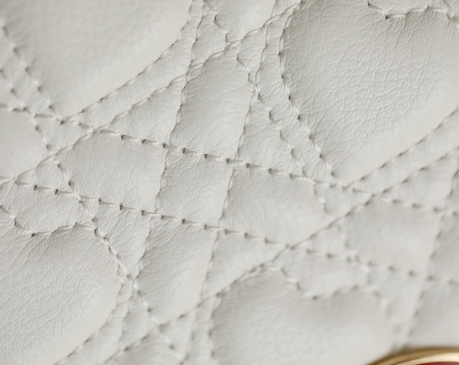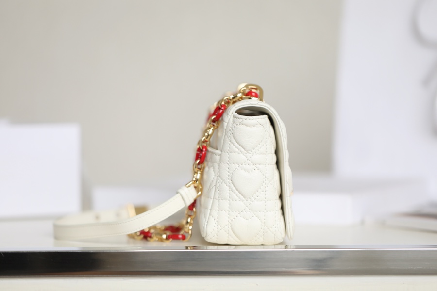 This Dior Caro handbag comes from the Dioramour limited series, combining elegance and modern style. Carefully crafted from milky white cow leather with heart-shaped patterned cannage topstitching. The flap is decorated with an enameled metal knob-style “CD” clasp, inspired by the closure of Christian Dior perfume bottles. The small style is equipped with a detachable “CD” logo chain shoulder strap as a finishing touch. It can be carried by hand, shoulder or cross-body, or can be replaced with an embroidered wide shoulder strap for a bright finishing touch. Wear it with everyday looks or evening wear.