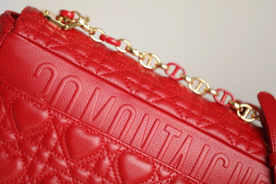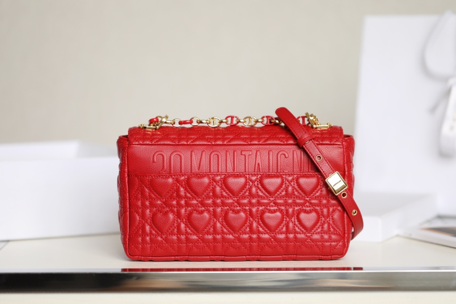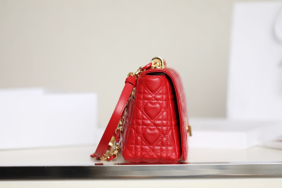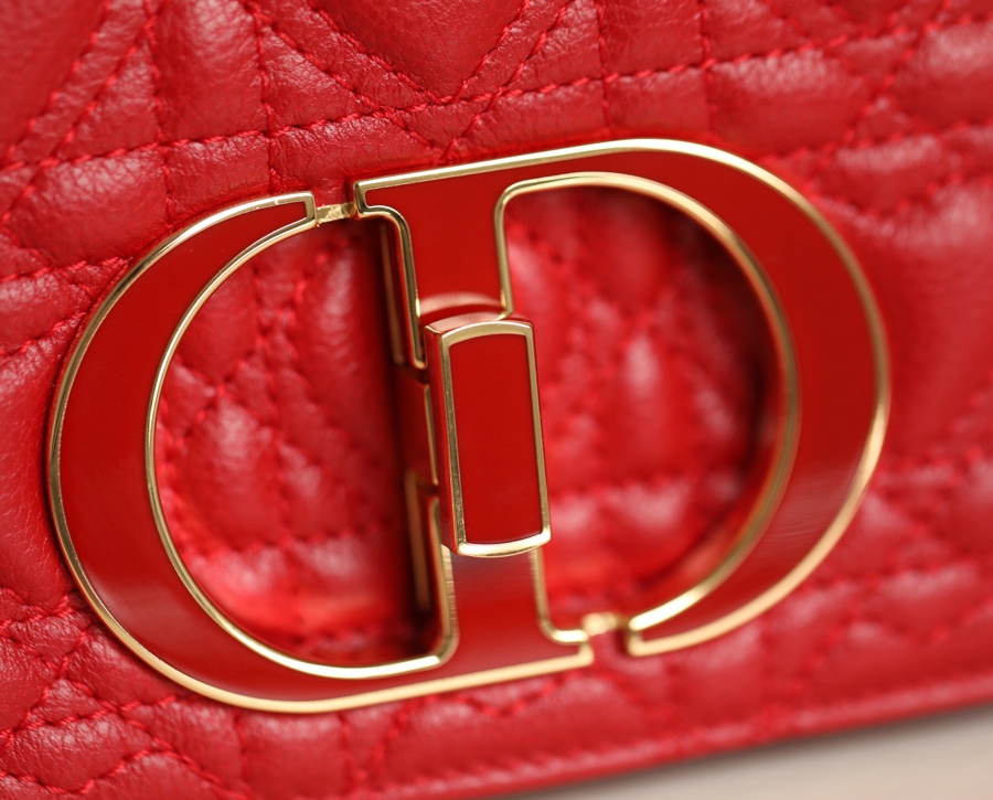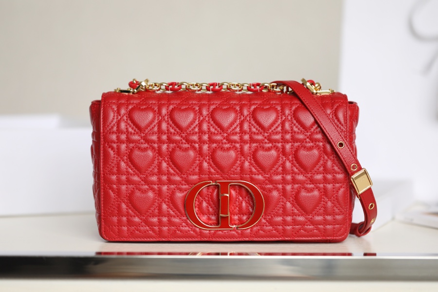 This Dior Caro handbag comes from the Dioramour limited series, combining elegance and modern style. Carefully crafted from red cow leather with heart-shaped cannage pattern topstitching. The flap is decorated with an enameled metal knob-style “CD” clasp, inspired by the closure of Christian Dior perfume bottles. The medium style is equipped with a detachable “CD” logo chain shoulder strap as a finishing touch. It can be carried by hand, shoulder or cross-body, or can be replaced with an embroidered wide shoulder strap for a bright finishing touch. Wear it with everyday looks or evening wear.