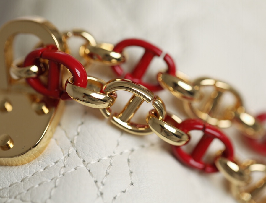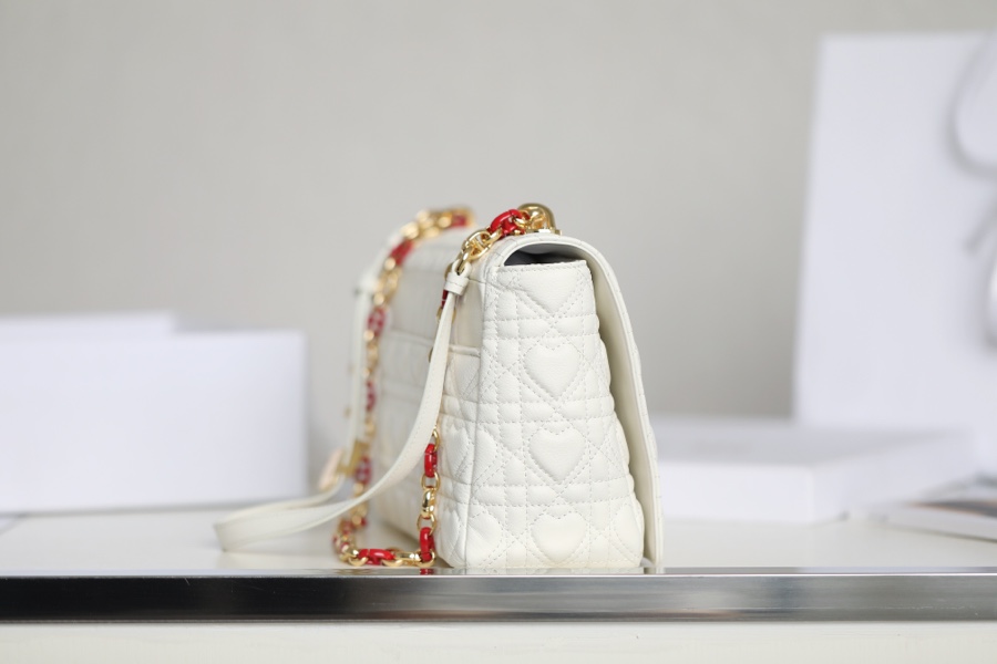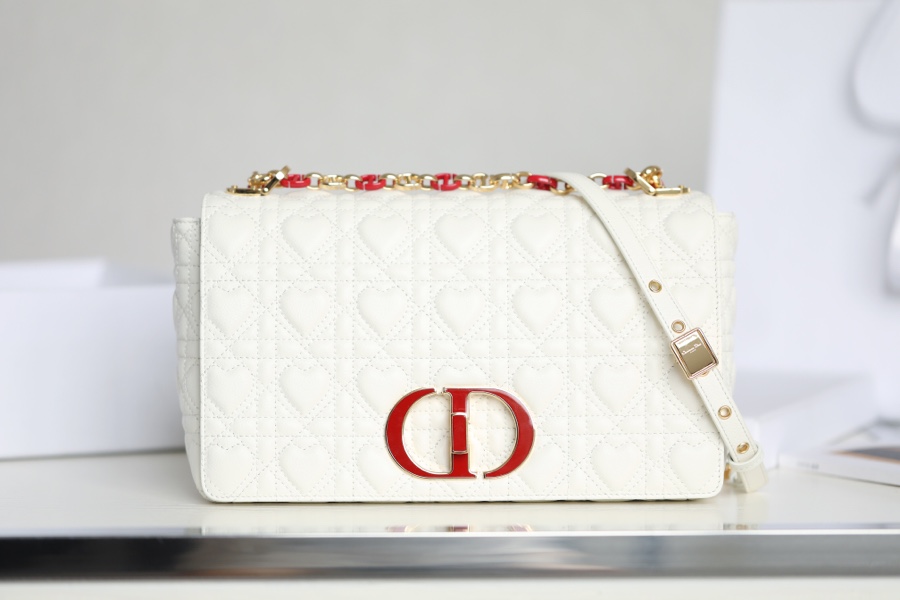 This Dior Caro handbag comes from the Dioramour limited series, combining elegance and modern style. Carefully crafted from milky white cow leather with heart-shaped patterned cannage topstitching. The flap is decorated with an enameled metal knob-style “CD” clasp, inspired by the closure of Christian Dior perfume bottles. The large style is equipped with a detachable “CD” logo chain shoulder strap as a finishing touch. It can be carried by hand, shoulder or cross-body, or can be replaced with an embroidered wide shoulder strap for a bright finishing touch. Wear it with everyday looks or evening wear.