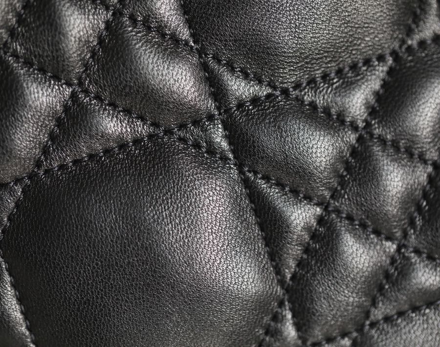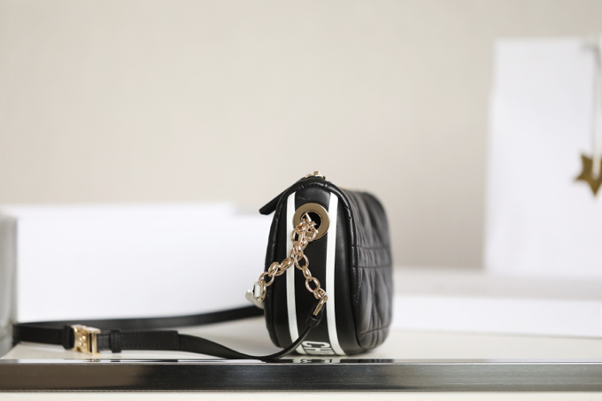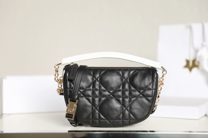 Newly launched this season, the stylish silhouette of Dior Vibe highlights the modern charm of a shoulder bag. Carefully crafted from black sheepskin, decorated with cannage pattern topstitching, suede lining adds a soft texture, and white “CHRISTIAN DIOR PARIS” logo adorns the bottom. Small style with handles, removable and adjustable shoulder strap and military-style buckle, can be carried by hand, shoulder or cross-body to complement everyday or sporty looks
