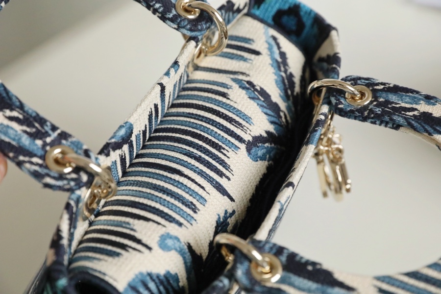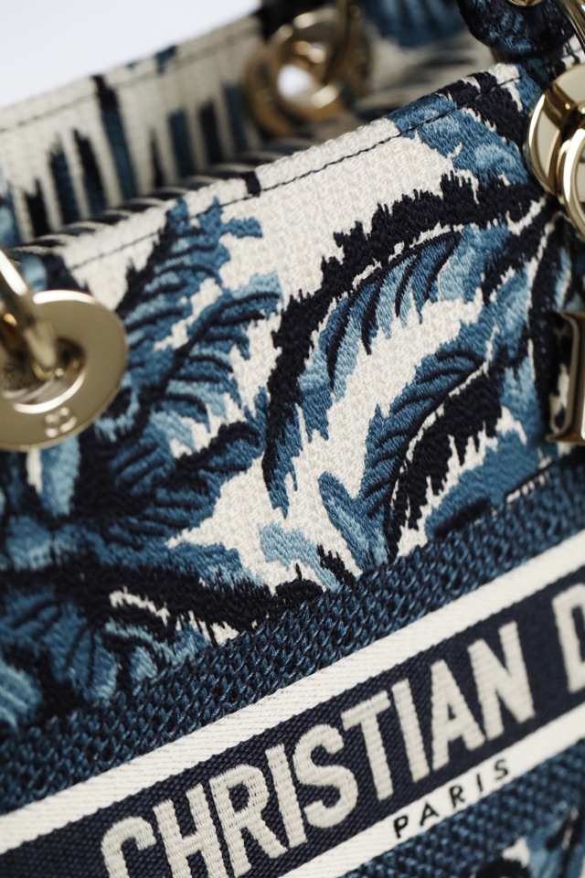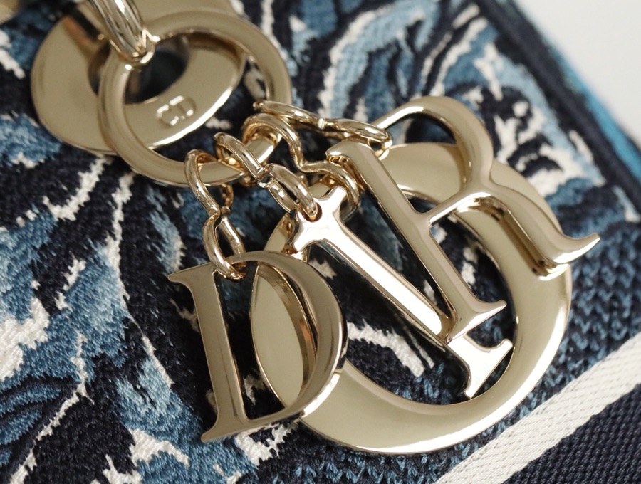 This Lady D-Lite handbag combines classic elegance with the fashionable style of the Dior brand. Decorated with blue Dior Palms embroidery throughout, the iconic Jouy print is reinterpreted. Decorated with the “Christian Dior” logo on the front, it is paired with a textured metal “D.I.O.R.” pendant with a light gold finish, adding a touch of agility to the exquisite silhouette. Medium style with removable wide reversible embroidered strap that can be worn by hand, shoulder or cross-body.