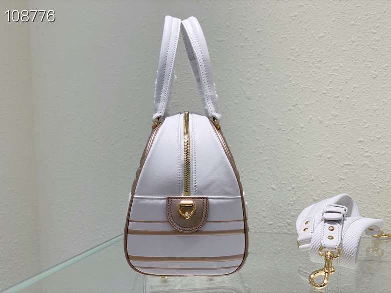 The new Dior Vibe Bowling zipper handbag launched this season is designed by Maria Grazia Chiuri (Maria Grazia Chiuri), integrating classic sports style with Dior haute couture style. Crafted from white and gold calfskin, this bag is decorated with a quilted effect Dior Étoile pattern, a new interpretation of Monsieur Dior’s beloved star pattern. “CHRISTIAN DIOR PARIS” signature on the front and zipped pocket. The base features a tonal rubber star pattern inspired by Dior sneakers. Available in a medium size, pair with the Dior Vibe sneakers for a sophisticated look. Size 34cm